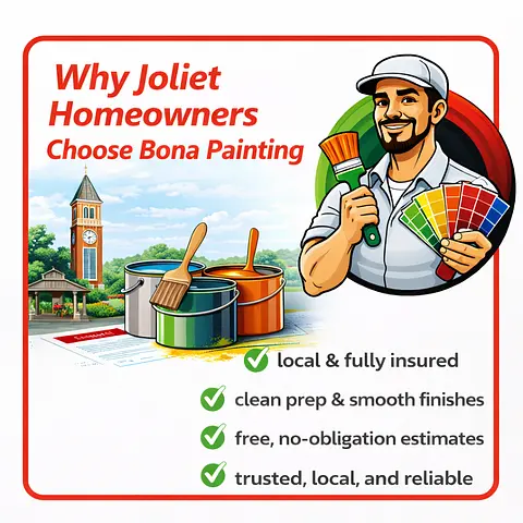 BenefitsWhy Joliet Homeowners Choose Bona PaintingProfessional, Clean FinishesTransparent Process & EstimatesRespectful, Low-Mess Job SitesDetail-First Prep for Long-Lasting Results